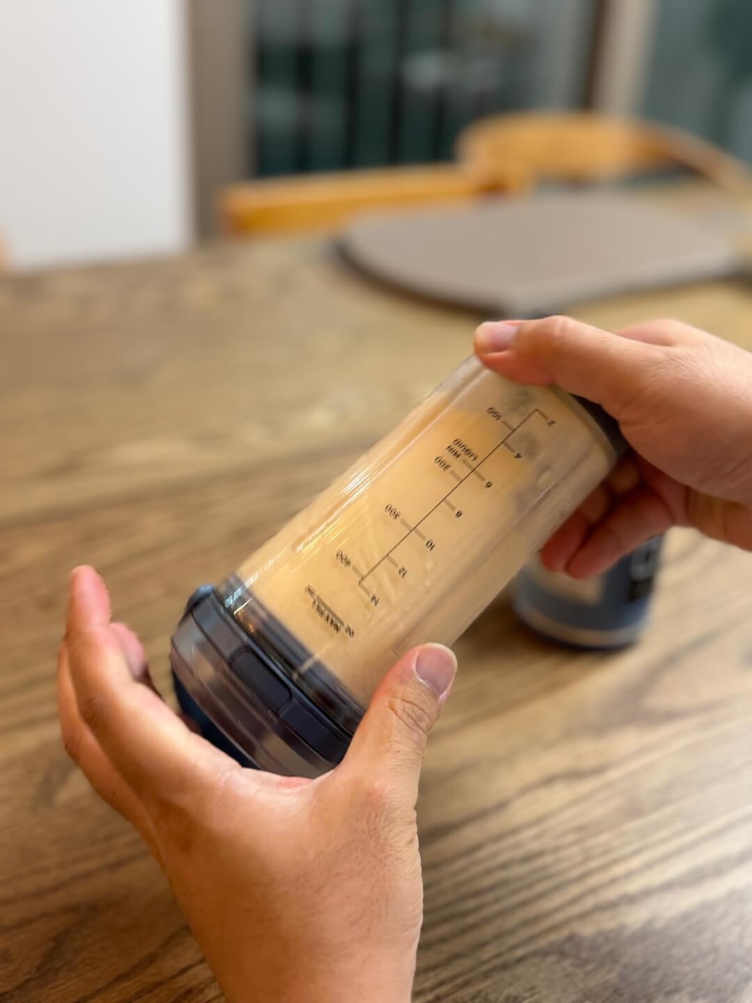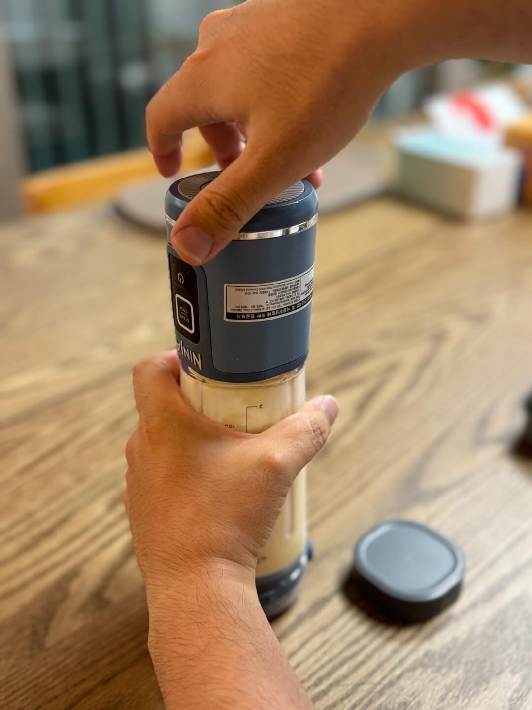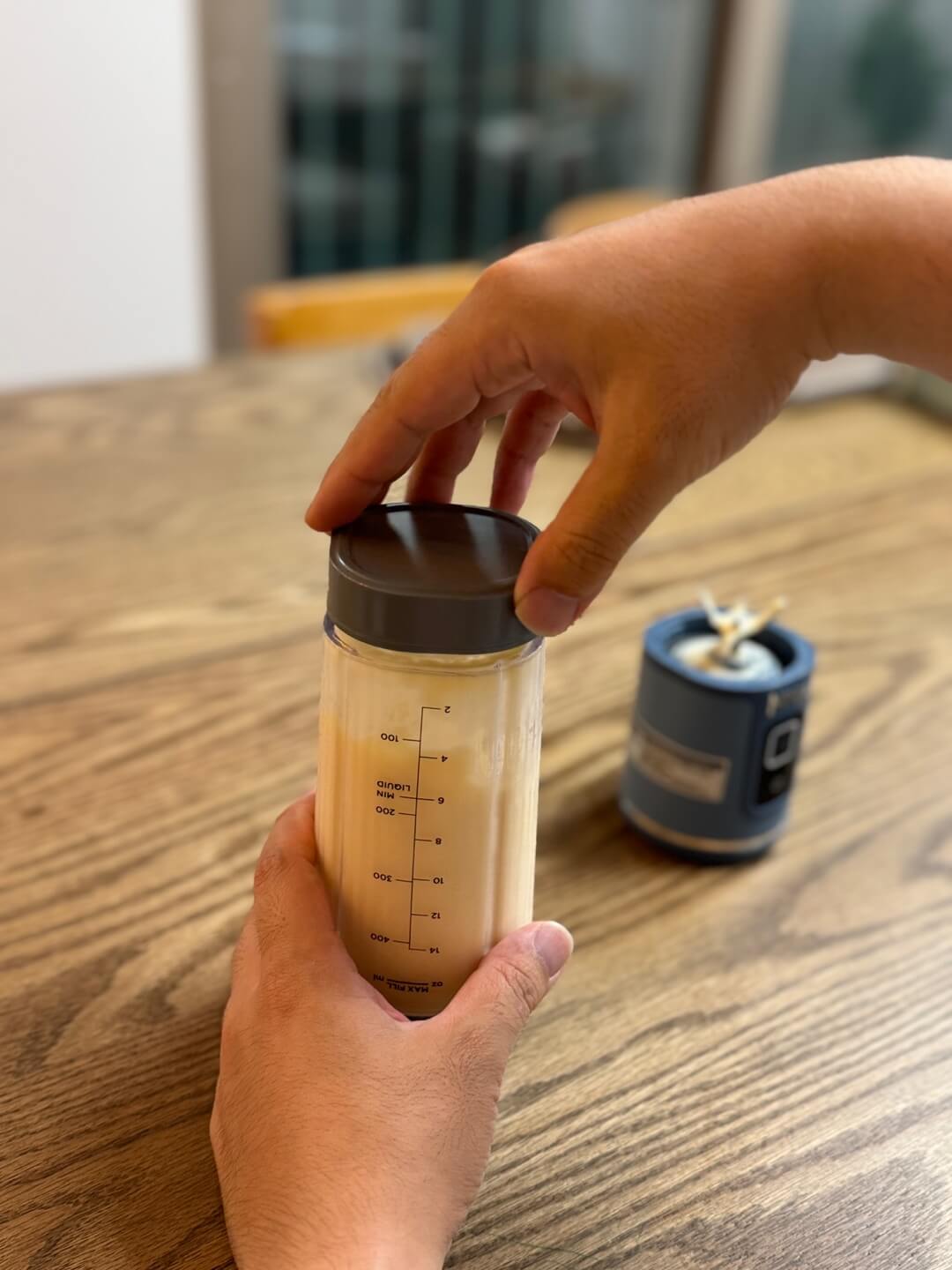 1. 닌자 블라스트 포터블 블랜더에 우유를 250ml 부어 넣습니다. (최소액체요구량이 200ml이므로 기호에 따라)