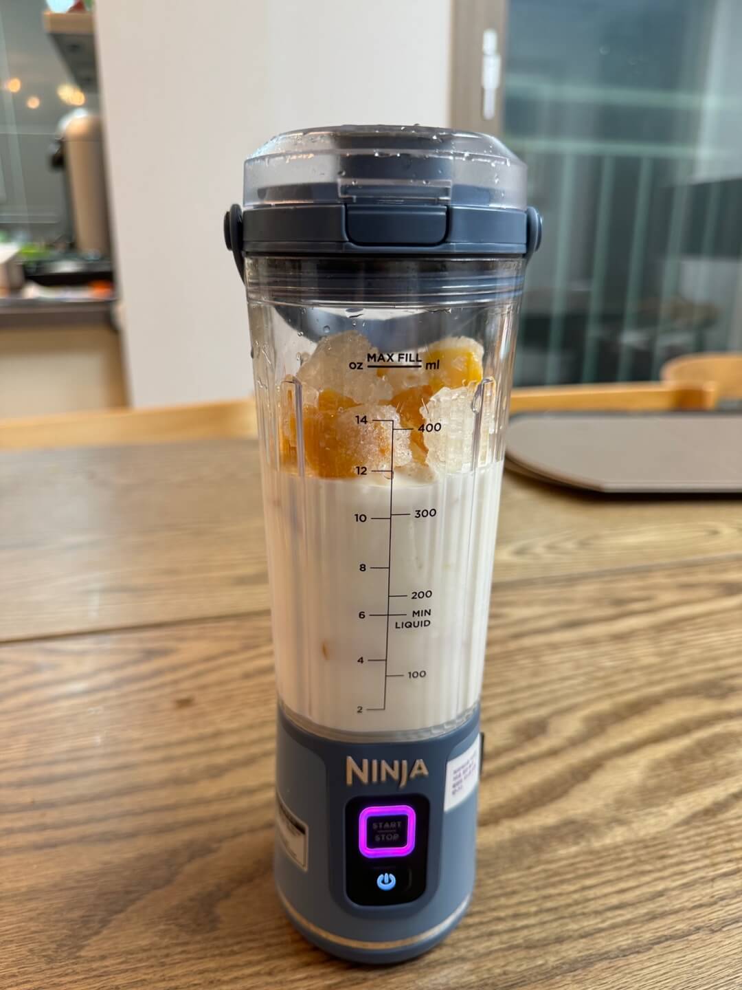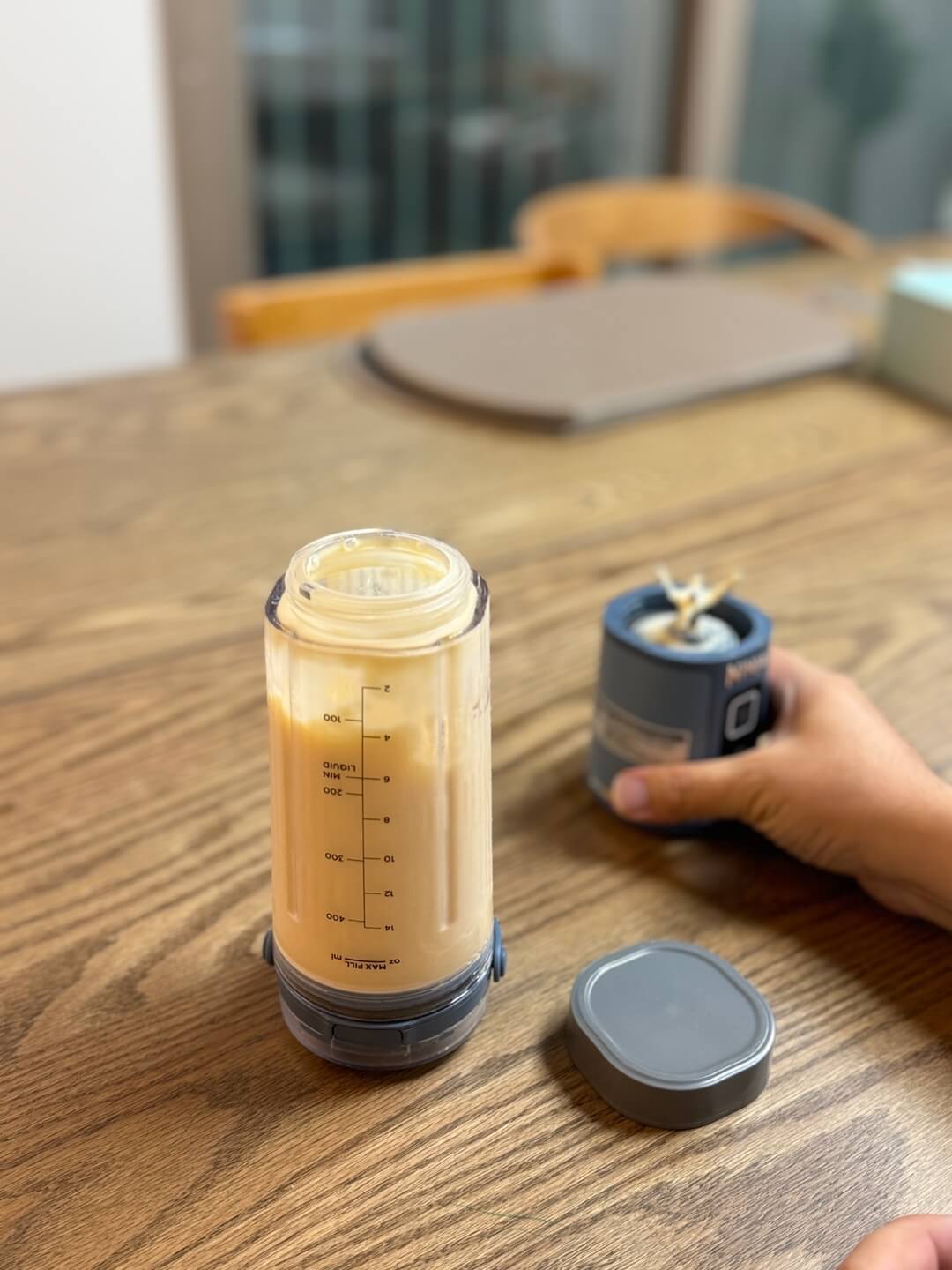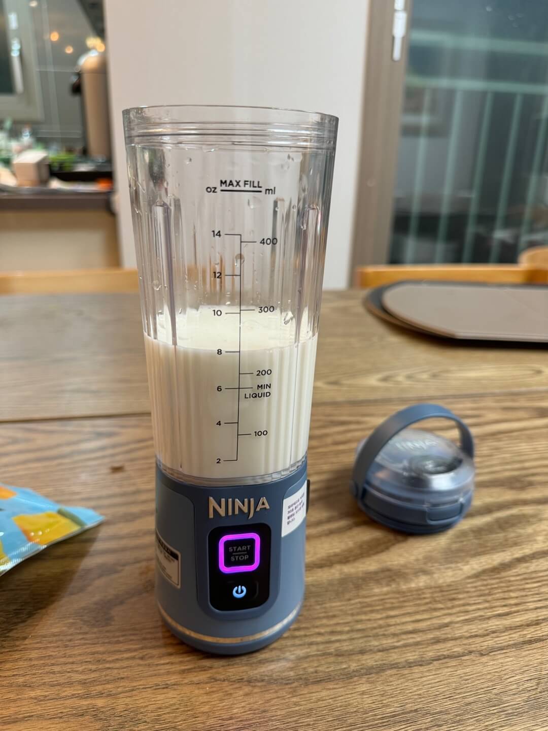 1. 닌자 블라스트 포터블 블랜더에 우유를 250ml 부어 넣습니다. (최소액체요구량이 200ml이므로 기호에 따라)