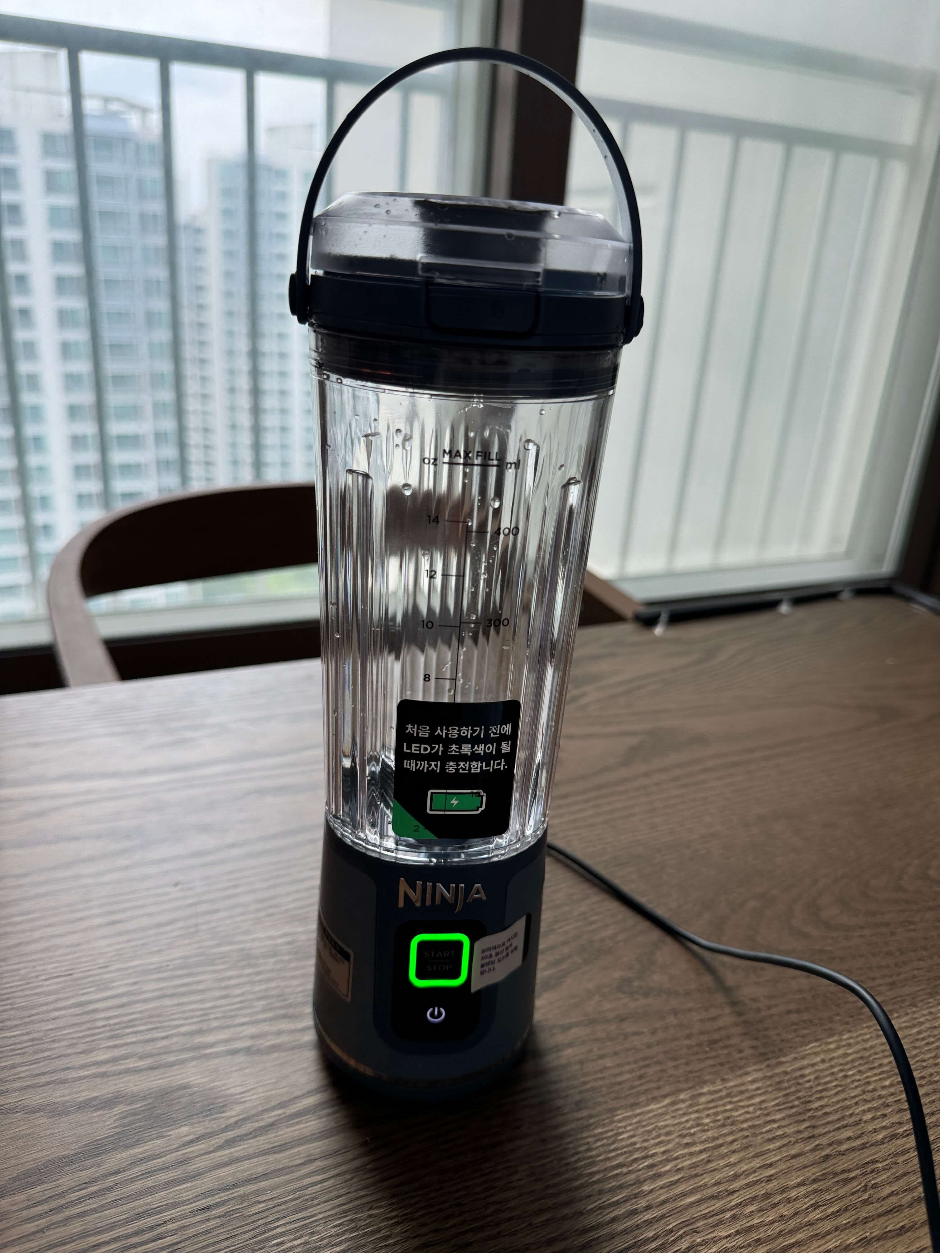 닌자 무선 블라스트 포터블 블랜더는 스위치를 켜고 스타트버튼을 누르면 30초 동안 알아서 주스를 만들어 줍니다.