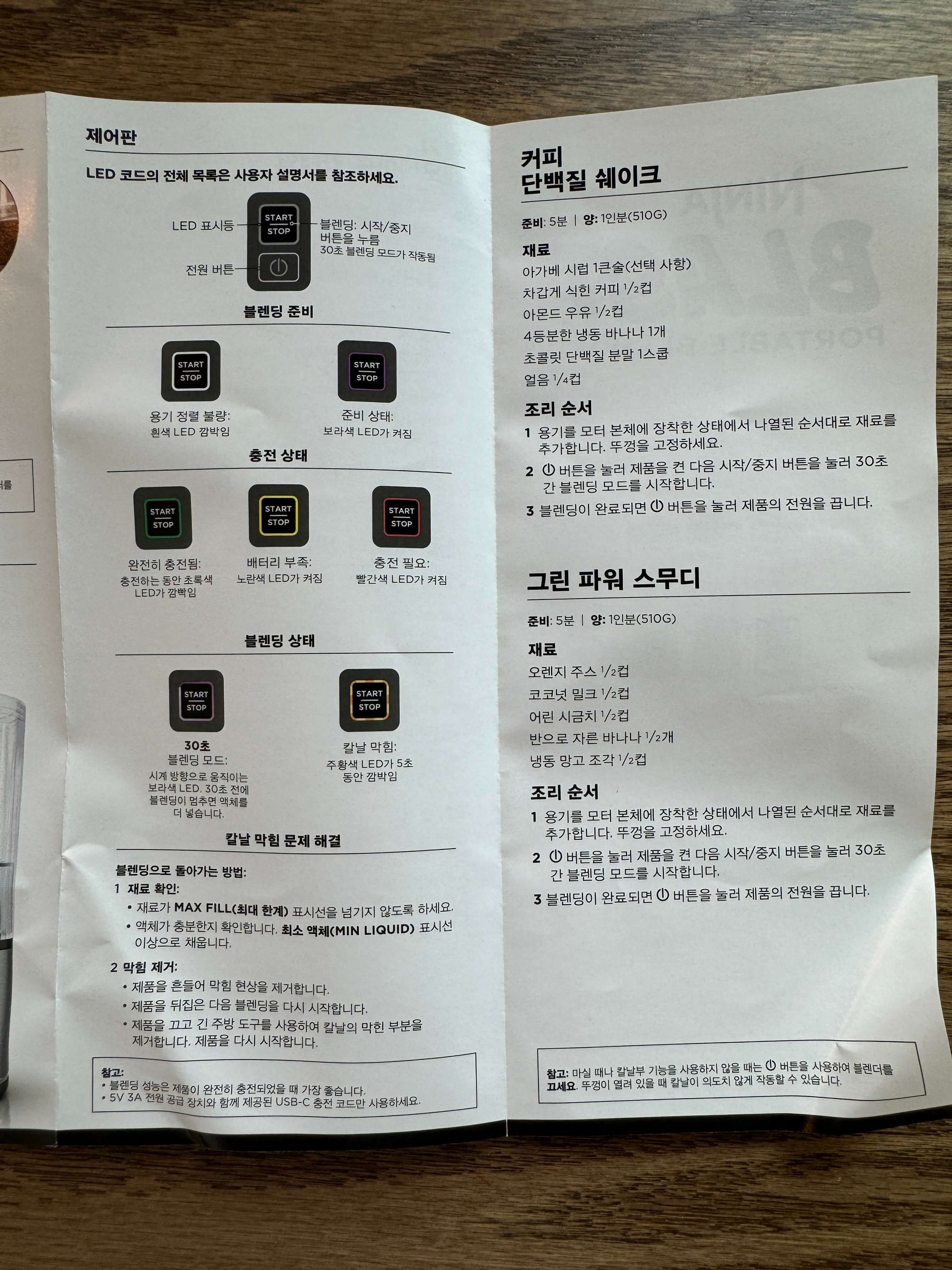 설명서에는 제품 조립방법, LED표시에 따른 상태확인, 스무디 레시피 등 유용한 정보들이 많으니