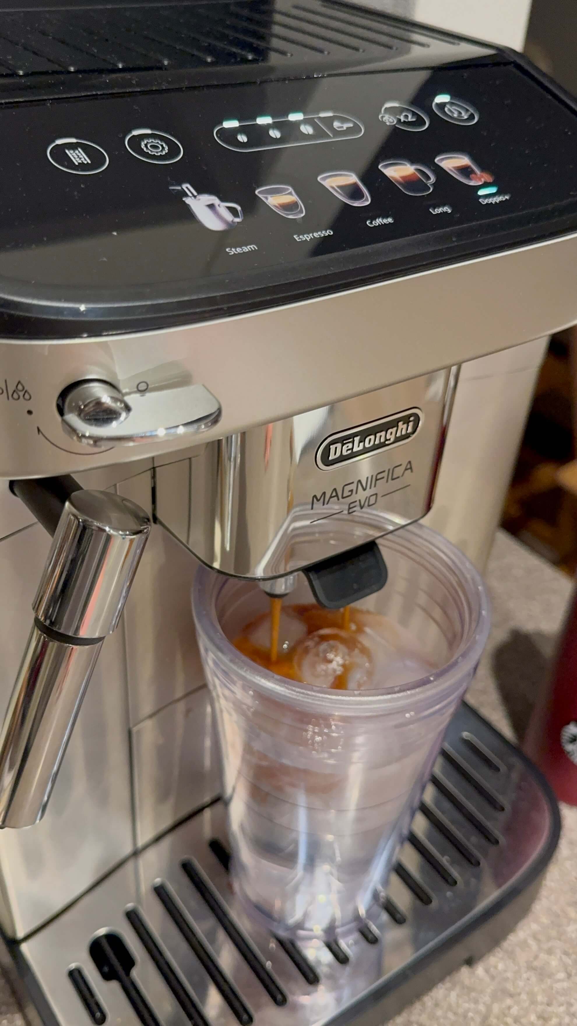 집에서 사용하는 드롱기 마그니피카 EVO 커피머신과의 조합도 만족스럽습니다. 먼저 컵에 얼음을 가득 담고, 에스프레소를 바로 추출하면 아이스 아메리카노가 순식간에 완성됩니다.
