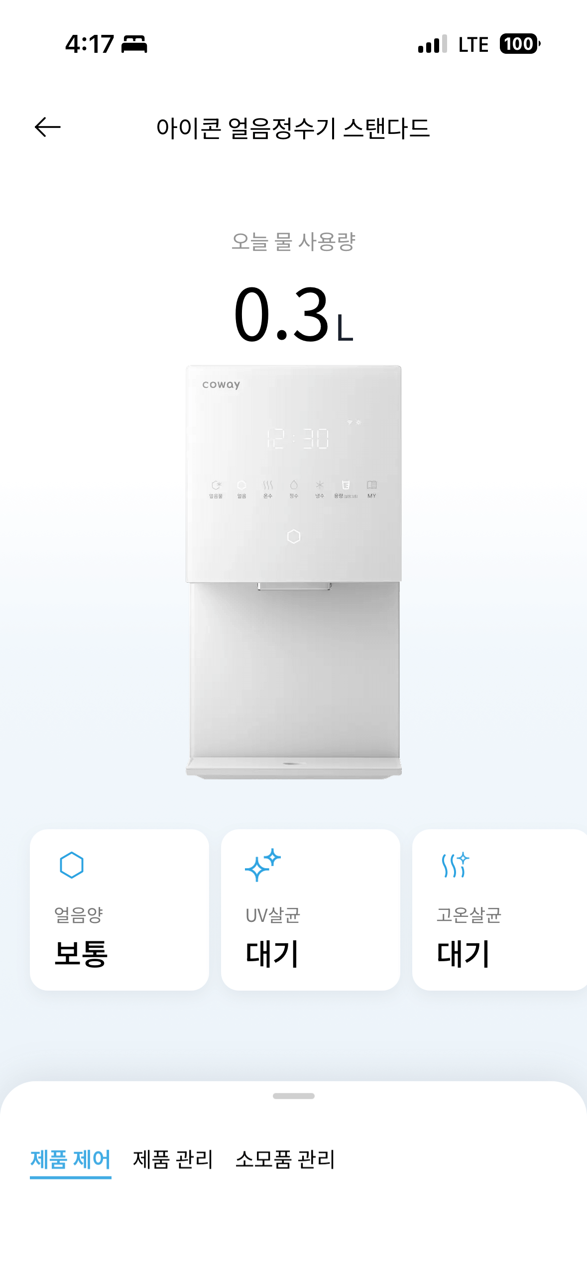 코웨이 앱을 통해 정수기 상태를 한눈에 확인할 수 있습니다. 하루 물 사용량, 냉수·온수·얼음 설정은 물론이고, 얼음 크기 조절도 앱에서 바로 가능합니다.