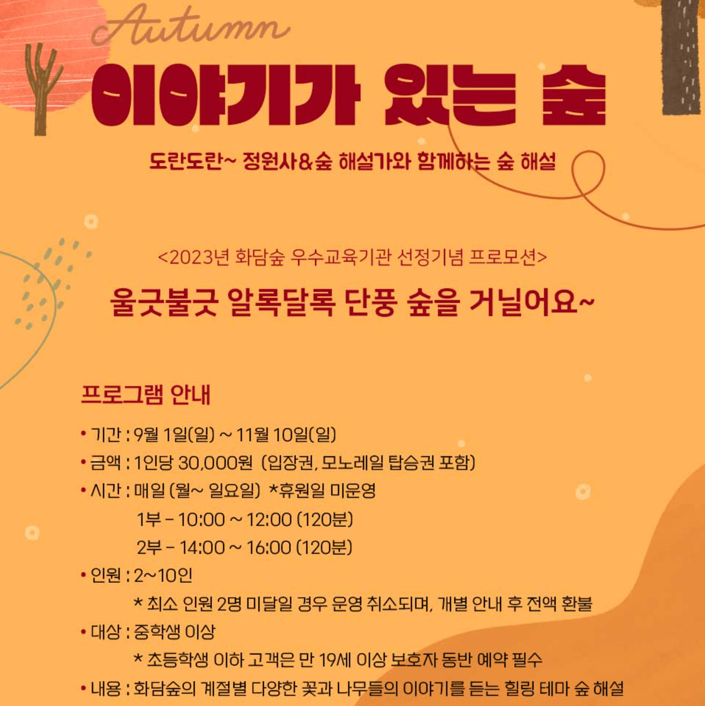- 편안한 복장 : 숲 속을 탐방하는 만큼 편안한 복장을 추천합니다. 운동화나 편한 신발을 착용하면 좋습니다.