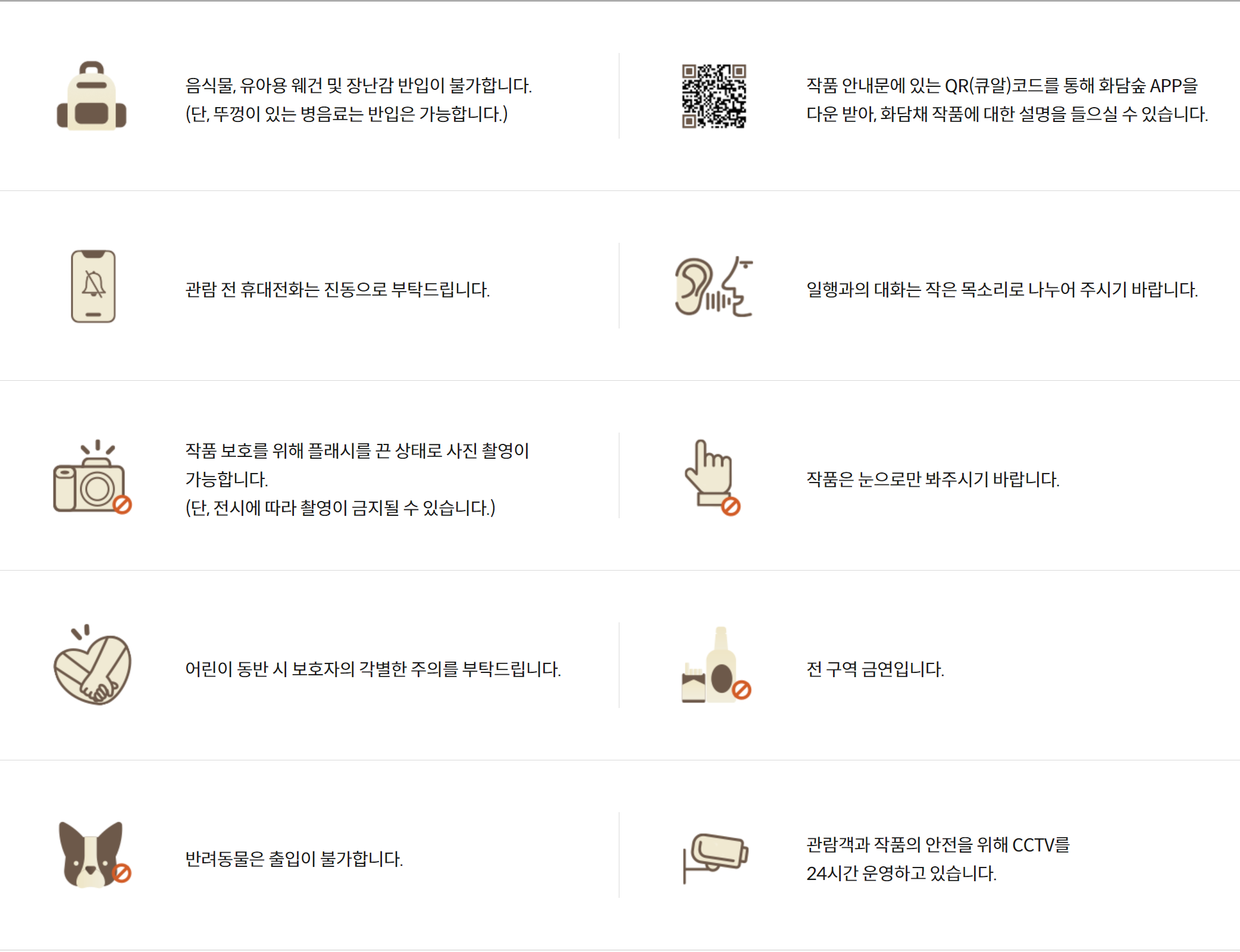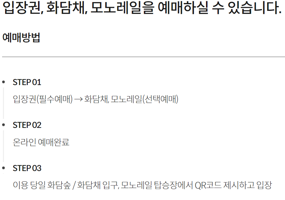 - QR코드 확인 : 발송된 QR코드를 확인하고, 입장 시 해당 QR코드를 제시하면 됩니다. 현장 발권은 불가하니, 꼭 온라인 예약을 통해 진행하세요.