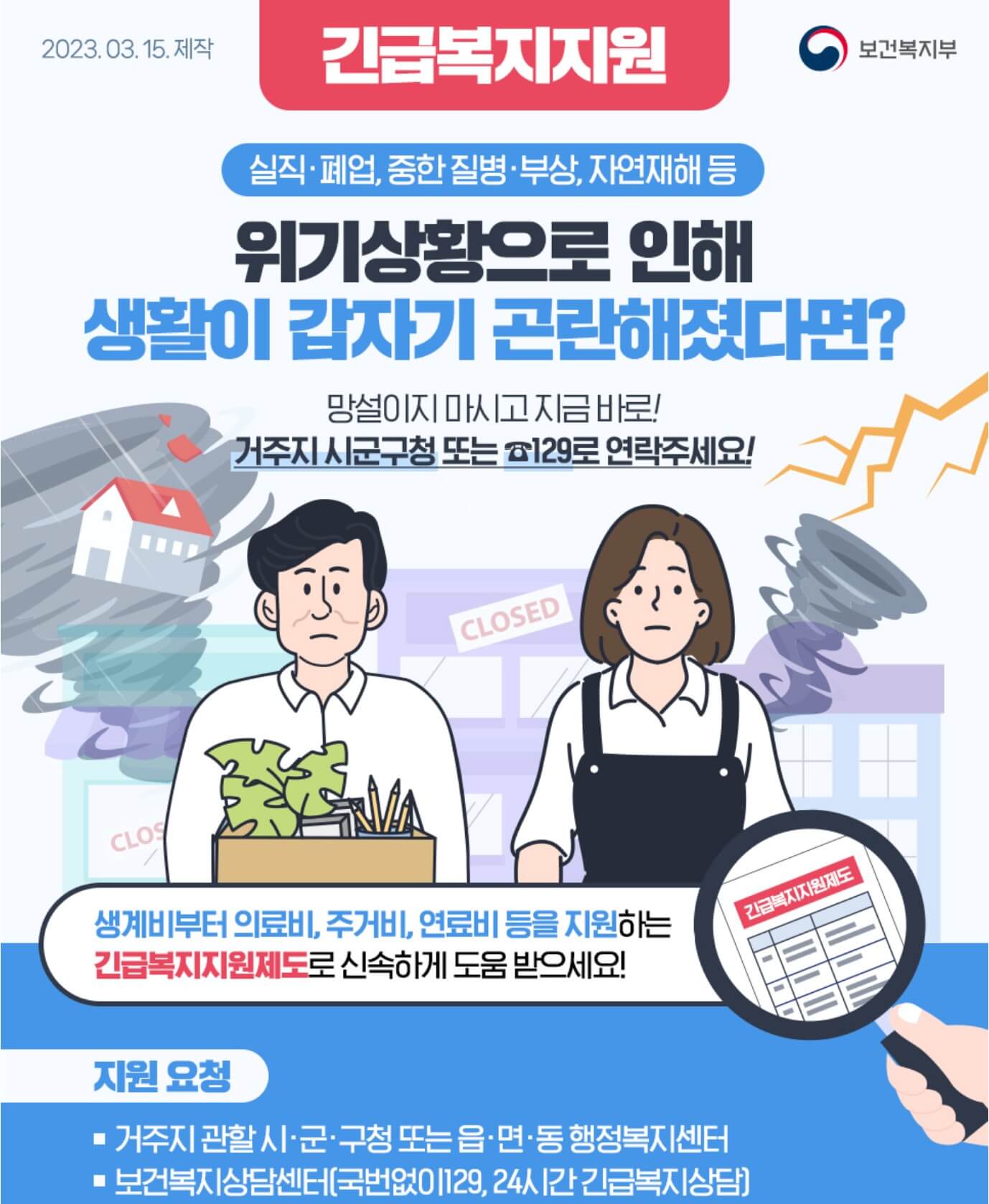 실직 폐업, 중한 질병 부상, 자연재해 등 위기상황으로 생활이 곤란해졌다면?