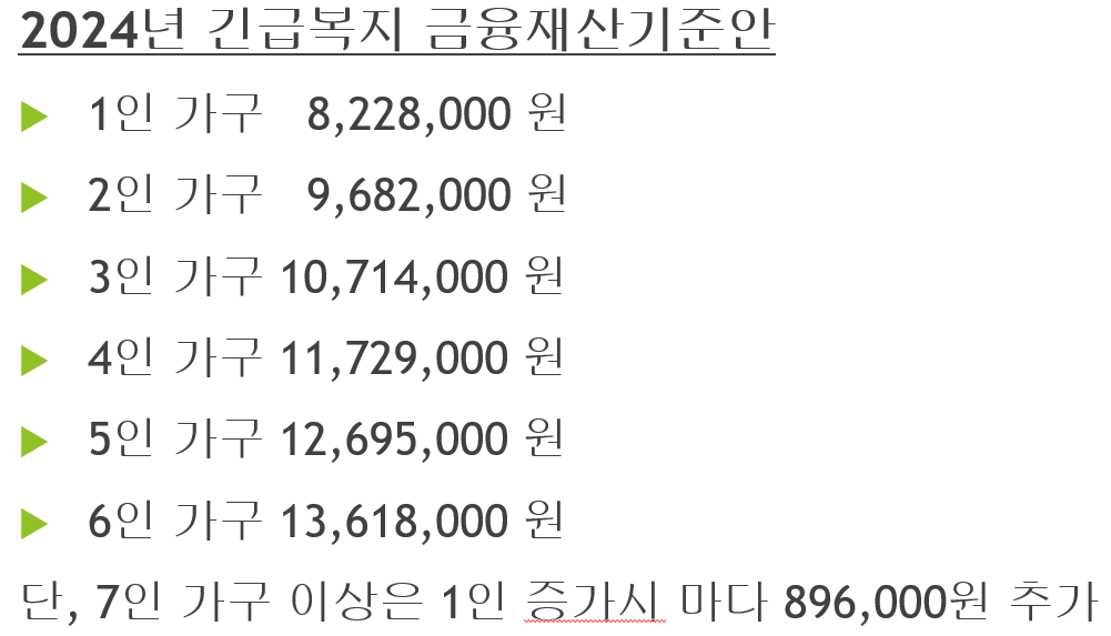 2024년 기준 중위소득을 반영한 가구원수에 따른 금융재산에 따라 선정됩니다.