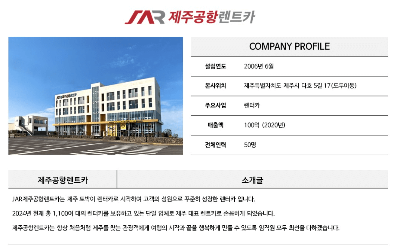 2006년에 설립된 JAR제주공항렌트카는 꾸준히 성장하여 약 1100대의 차량을 보유하고 있어 이용자들은 언제든 합리적인 가격에 렌트를 할 수 있는 업체 입니다. 제주공항에서 매우 가까운 위치에 있어 접근성이 뛰어나며 다양한 차량을 보유하고 있습니다.