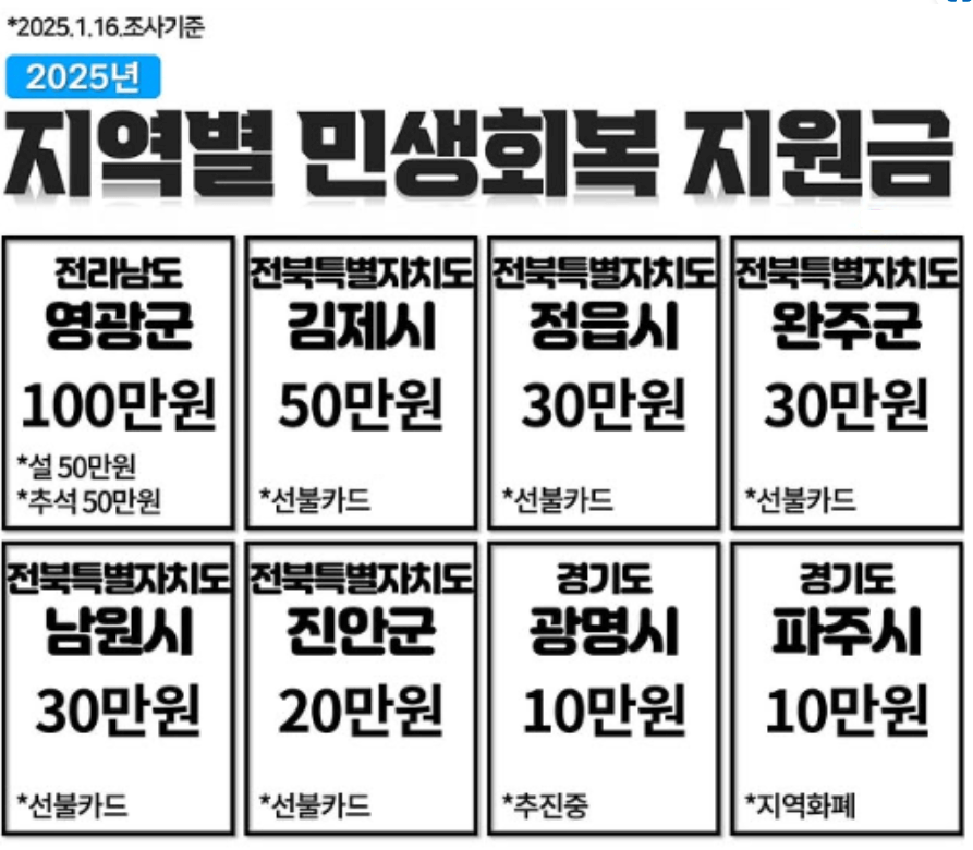 2025년에는 각 지역별로 지원금이 다르게 책정되어 있습니다. 예를 들어, 전라남도 영광군은 100만원, 전라북도 김제시는 50만원의 지원금을 받을 수 있습니다. 이러한 지역별 차이는 각 지자체의 재정 상황과 필요에 따라 달라지므로, 거주하는 지역의 지원금 현황을 꼭 확인해야 합니다.