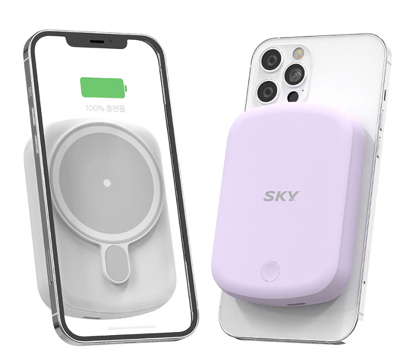 SKY 맥세이프 보조배터리 : 부드러운 라벤더 색상으로 디자인이 세련되며, 20W 고속 충전을 지원합니다. 가격도 2만 원 대로 저렴한 편에 속합니다.