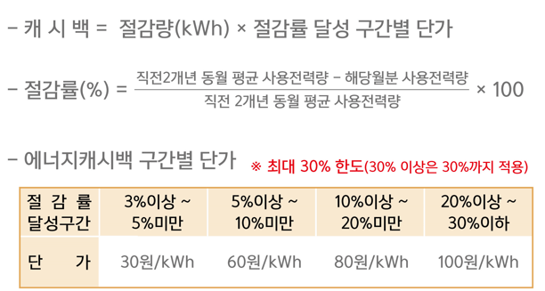 신청월의 전기 사용량을 기준으로 작년 2개년 동월 평균 전기 사용량과 비교하여 절감량 및 절감률을 산정하고, 절감률 수준(3%~30%)에 따라 구간별 단가를 적용하여 캐시백 금액을 산출합니다.