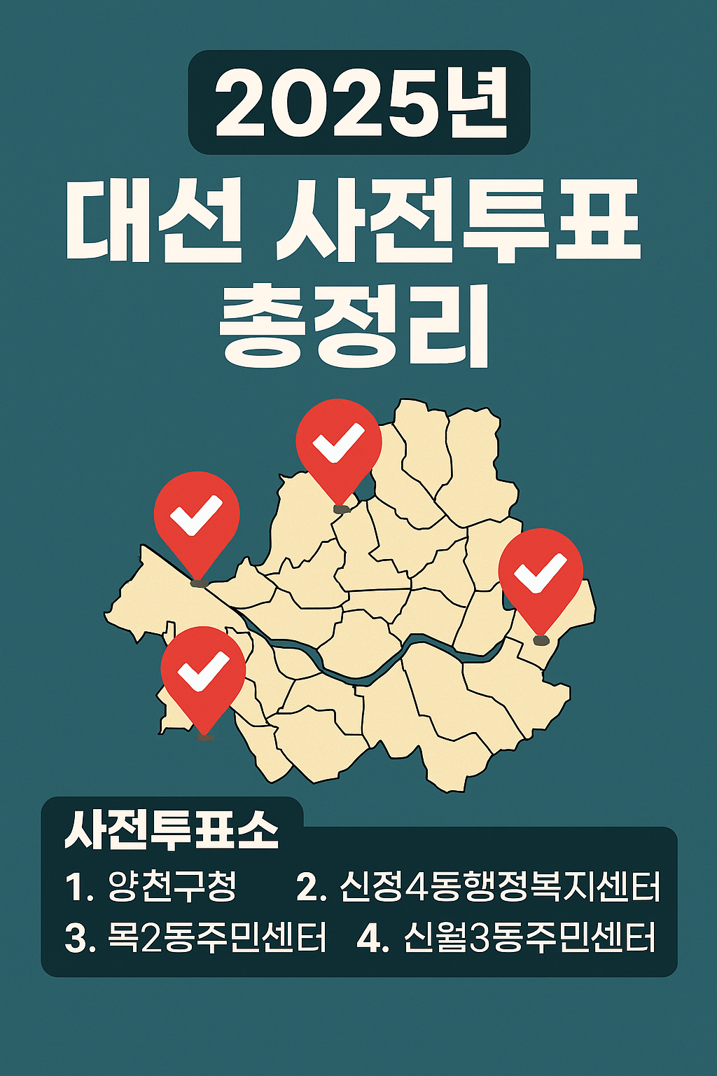 2025년 제21대 대통령 선거의 사전투표가 5월 29일(목)과 30일(금), 양일간 오전 6시부터 오후 6시까지 진행됩니다. 서울시 양천구에 거주하시는 유권자분들을 위해 사전투표소 정보를 정리해드리겠습니다.