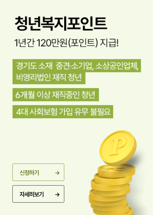 경기도 청년복지포인트는 경기도에 거주하며 중소기업 등에 재직 중인 청년에게 연간 120만원 상당의 포인트를 제공하는 제도입니다.